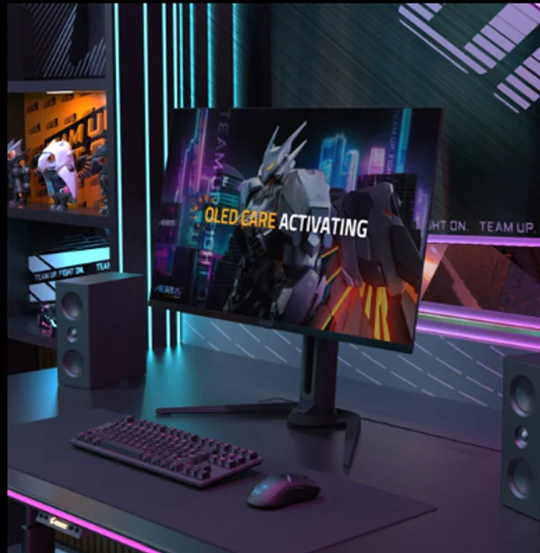 AORUS FO27Q5P, her piksele kadar ödünsüz 2K görüntü kalitesi ve eşsiz oyun performansı sunan göz alıcı 27 inç QD-OLED ekrana sahip.