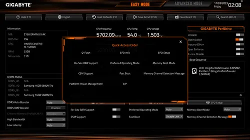 GIGABYTE UC BIOS'un Hızlı Erişim fonksiyonu, GELİŞMİŞ MOD'dan 9 pratik ön ayar seçeneği seçer ve bunları KOLAY MOD'a yerleştirerek geçiş yapmaya veya aramaya gerek kalmadan zahmetsiz erişim sağlar.