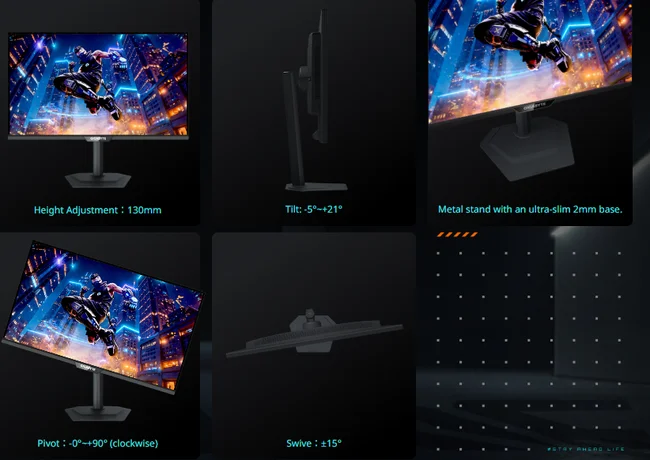 GIGABYTE Oyun monitörü, geniş bir yükseklik ve eğim ayarlama aralığı sunmak üzere ergonomik olarak tasarlanmış özel bir standa sahiptir.