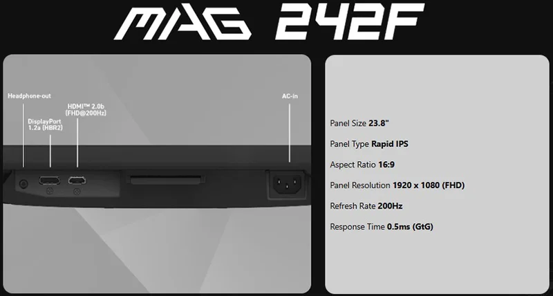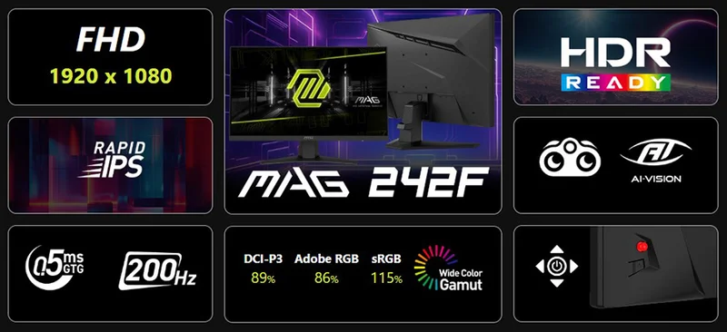 MAG 242F oyuncu monitörü ile sürükleyici bir oyun deneyimi yaşayın. 1920x1080 (FHD) panel, 200Hz tazeleme hızı, 0.5ms (GtG, Min) hızlı tepki süresi ile bu monitör kontrast ve gölge ayarları sayesinde göz alıcı detaylar sunan HDR Ready özelliğine sahiptir. Rekabetçi FPS oyunları, RPG/MMORPG ve savaş/yarış simülatörleri gibi oyun türlerinde MSI MAG 242F Gaming monitör oyun deneyiminizi yepyeni bir seviyeye taşıyarak oyunun ötesini görmenizi sağlar.
