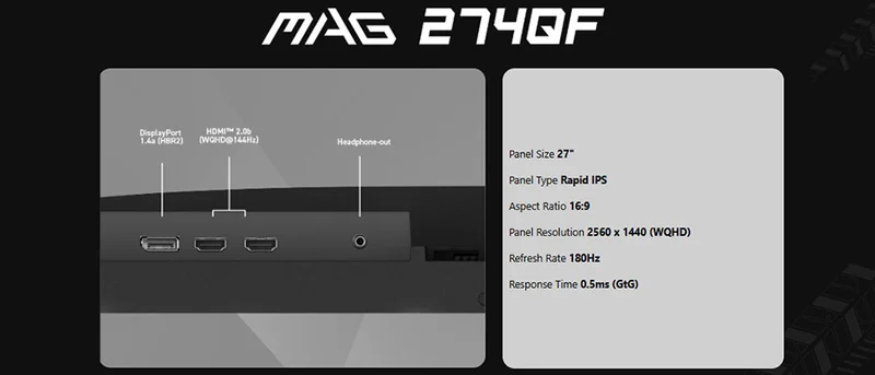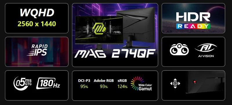 MAG 274QF oyun monitörüyle sürükleyici bir oyun deneyimi yaşayın. MAG 274QF 2560x1440 (WQHD) panel, 180 Hz yenileme hızı ve 0,5 ms (GtG, Min) hızlı tepki süresi sunar.HDR Ready özelliğine sahiptir. Rekabetçi FPS oyunları, RPG/MMORPG ve savaş/yarış simülatörleri gibi oyun türlerinde MSI MAG 274QF Gaming monitör oyun deneyiminizi yepyeni bir seviyeye taşıyarak oyunun ötesini görmenizi sağlar.