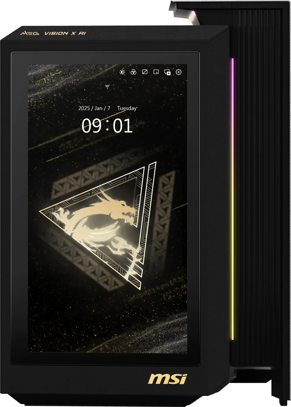 MEG VISION X AI, dokunmatik ön ekranı AI HMI (insan-makine arayüzü) üzerinde MSI’ın en yeni AI teknolojisini sunuyor. Günümüzün en yeni işlemcisi, en güçlü ekran kartı ve Silent Storm Cooling AI teknolojisi ile donatıldı ve rakipsiz AI oyun deneyimi sayesinde eşsiz bir oyun perfomansına sahip. Yapay zekanın sınırsız olanaklarını keşfetmek için diğer oyun tutkunlarına katılın!